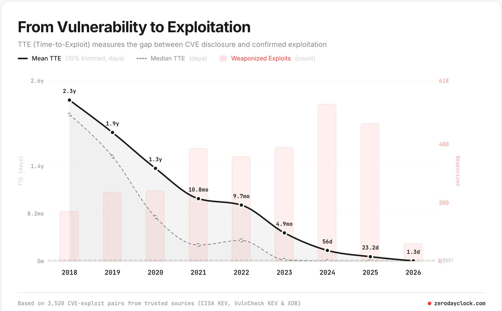 The data is stark. zerodayclock.com from Sergej Epp tracks 3,520 CVE-exploit pairs from trusted sources (CISA KEV, VulnCheck KEV, XDB). The mean time-to-exploit has collapsed from 2.3 years in 2018 to 1.3 days in 2026.
