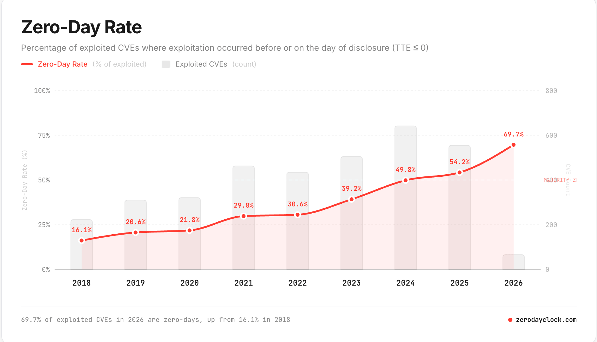 And the zero-day rate is accelerating. In 2018, 16.1% of exploited CVEs were weaponised on or before disclosure day. In 2026, that number is 69.7%. Nearly seven out of ten exploited vulnerabilities are compromised before or on the day they are publicly known.