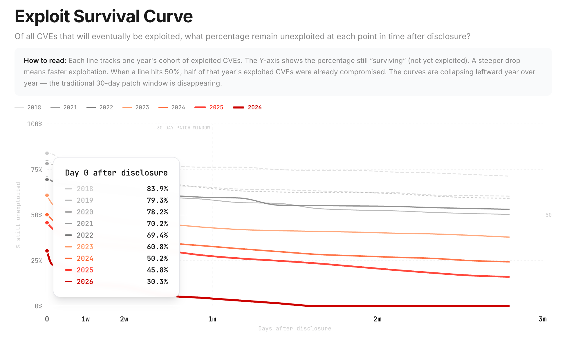 Look at the exploit survival curve. On Day 0 after disclosure in 2018, 83.9% of CVEs were still unexploited. In 2026, only 30.3% survive Day 0. The traditional 30-day patch window is gone. The curves are collapsing leftward, year over year.