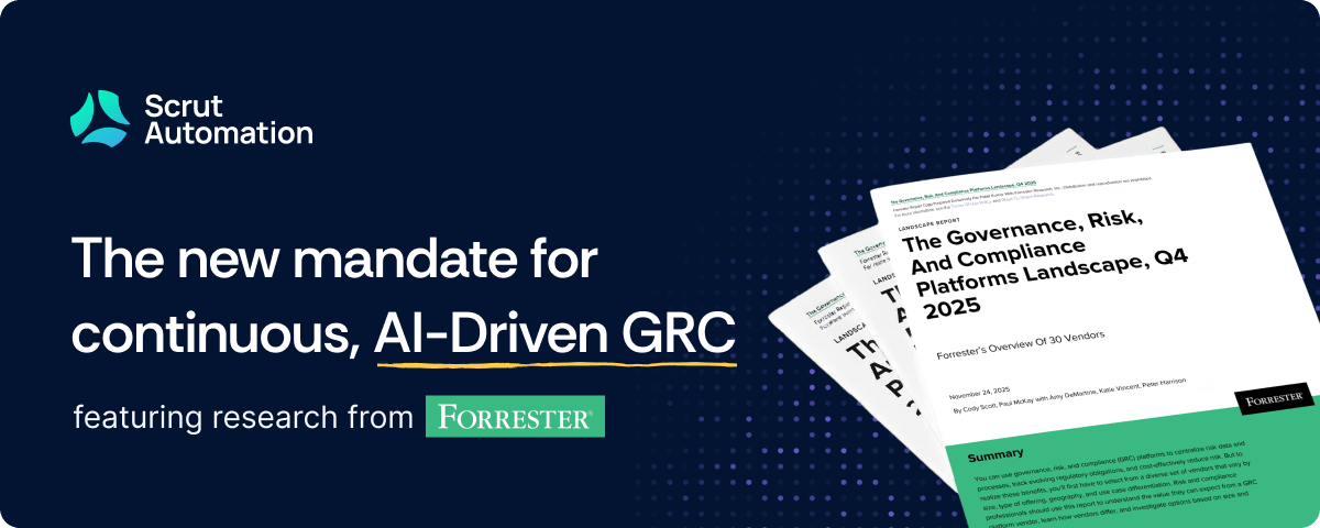 Forrester’s Q4 2025 GRC Platforms Landscape lays out the playbook: integrate assurance into pipelines, automate evidence, enable continuous validation, and deploy AI that acts (not just chats). Scrut was featured among the 30 vendors in the report. See how Scrut Teammates was built to execute compliance busywork, with human-in-the-loop.